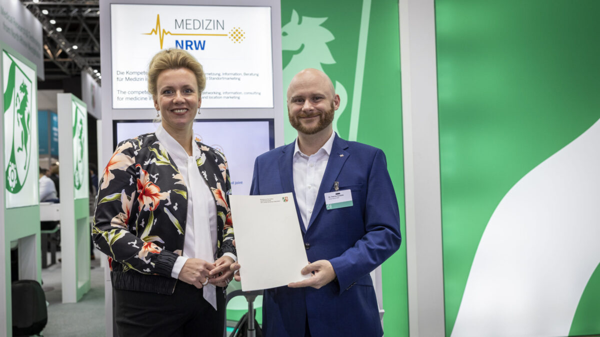 NRW-Wissenschaftsministerin Ina Brandes überreichte den Vertrag für eine weitere Förderung des Clusters Medizin.NRW an Clustermanager Dr. Patrick Guidato. Bei ihrem Messe-Besuch gab die Ministerin bekannt, dass das Cluster für drei weitere Jahre bis 2027 mit rund drei Millionen Euro vom Land NRW finanziert wird.